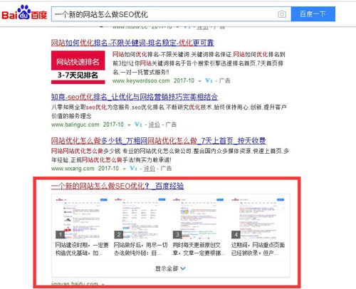 其實在國內,也并非完全沒有這種展示方式。假如搜索“一個新的網站怎么做SEO優化”,百度的搜索結果頁面如下: